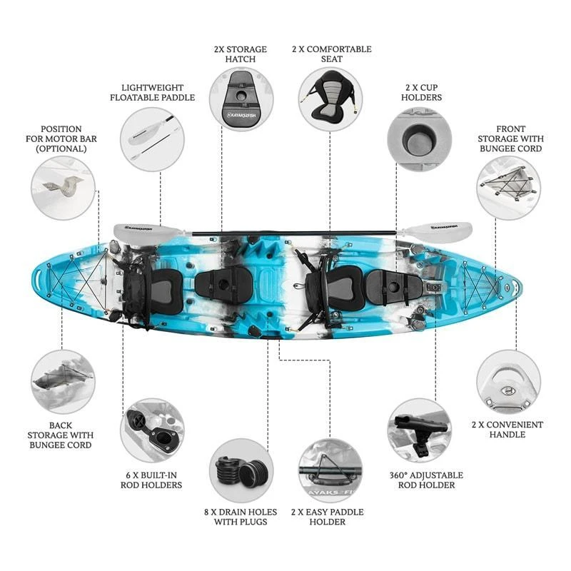 - Scupper holes with drain plugs around the body of Kayak for easy drainage if needed.