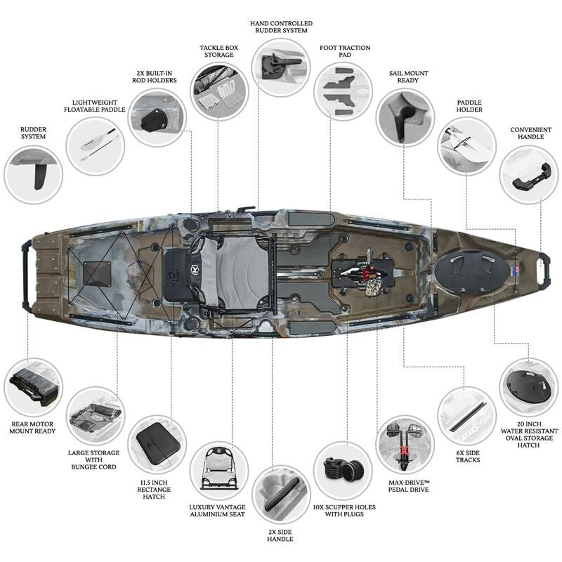 The Max-Drive™ Pedal drive allows fast but smooth-and-easy pedal acceleration and stopping; whether travelling long distances between fishing spots or for nuanced kayak positioning while sneaking up on the big ones. Lightweight premium pedal power is at your back and call to hit every one of your secret spots and then get home quick against wind and tides.