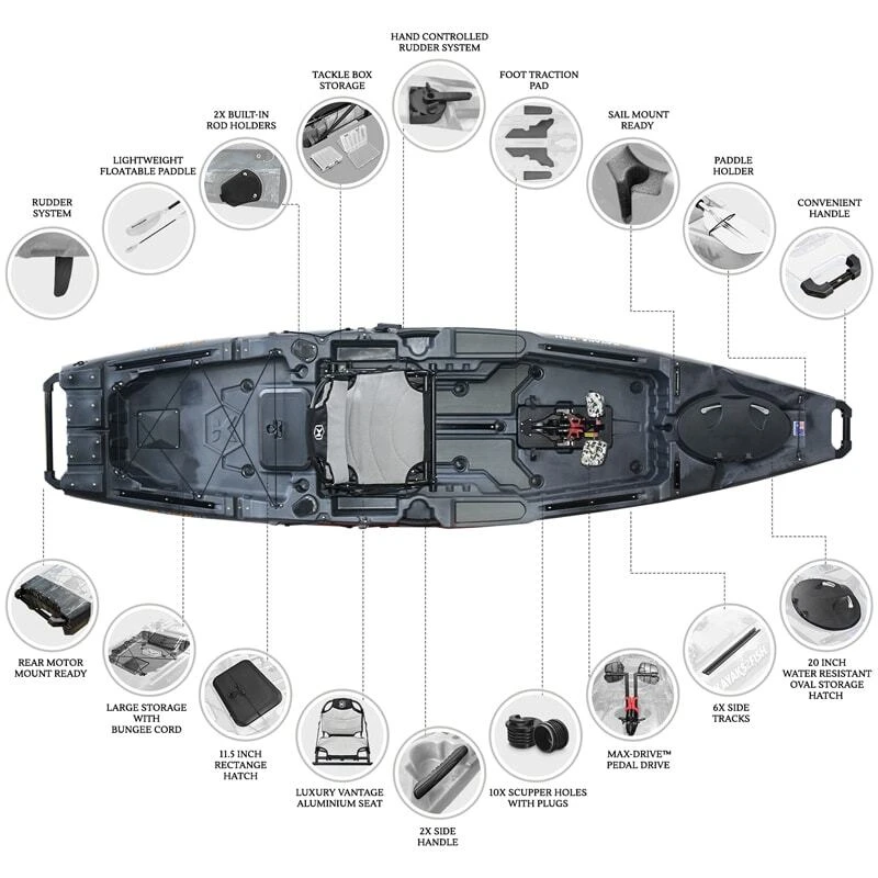 The Max-Drive™ Pedal drive allows fast but smooth-and-easy pedal acceleration and stopping; whether travelling long distances between fishing spots or for nuanced kayak positioning while sneaking up on the big ones. Lightweight premium pedal power is at your back and call to hit every one of your secret spots and then get home quick against wind and tides.