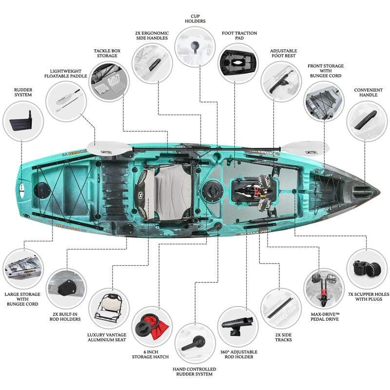 The Max-Drive™ Pedal drive allows fast but smooth-and-easy pedal acceleration and stopping; whether travelling long distances between fishing spots or for nuanced kayak positioning while sneaking up on the big ones. Lightweight premium pedal power is at your back and call to hit every one of your secret spots and then get home quick against wind and tides.