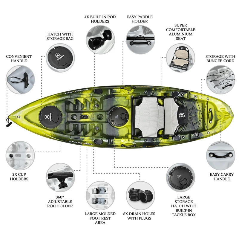 - Six scupper holes with drain plugs around the body of Kayak for easy drainage if needed.