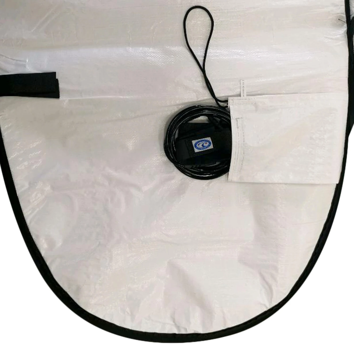 The SUP bad comes with a padding (7mm) on both sides, nose reinforcement, and a padded shoulder strap add extra protection and comfort. The bottom side is heat-reflective and the interior lining is wax and UV resistant.